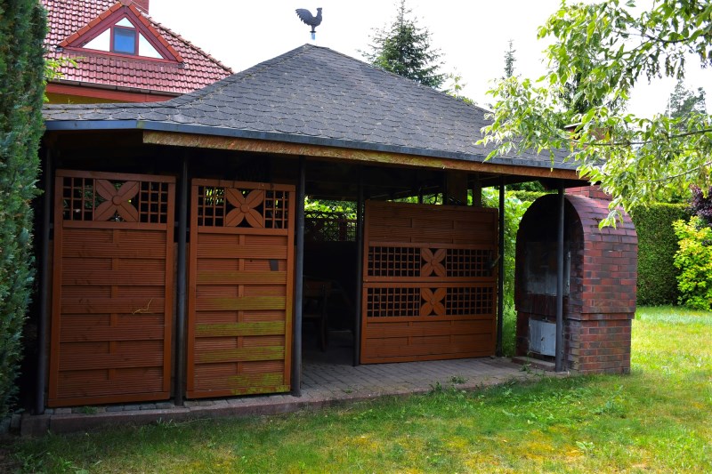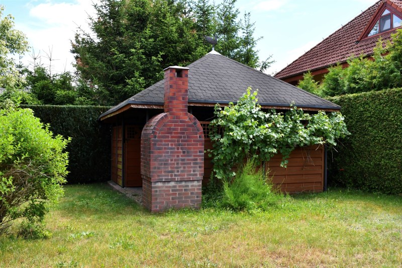 Na działce znajduje się murowany grill, miejsce pod zadaszeniem do wypoczynku lub wspólnych posiłków na świeżym powietrzu oraz pomieszczenie do składowania drewna.
