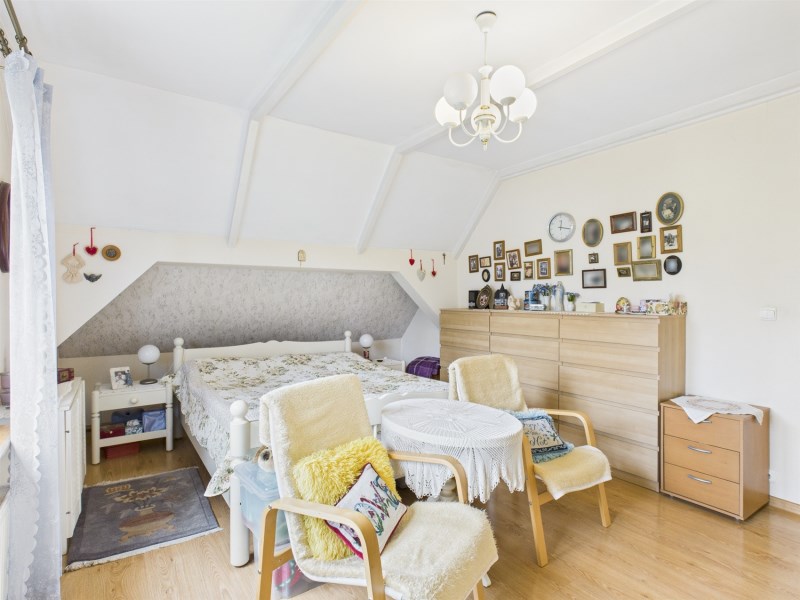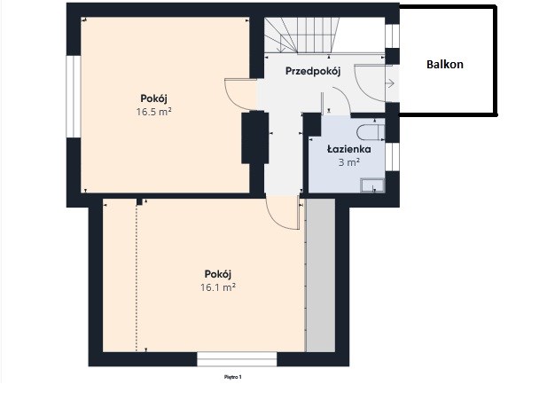 Na piętro prowadzą wygodne schody. Znajdują się tam dwa duże, ustawne pokoje (każdy o pow. ok. 16 m²) oraz druga łazienka (3 m²). Z przedpokoju jest wyjście na balkon – idealne miejsce na poranną kawę lub chwilę relaksu.