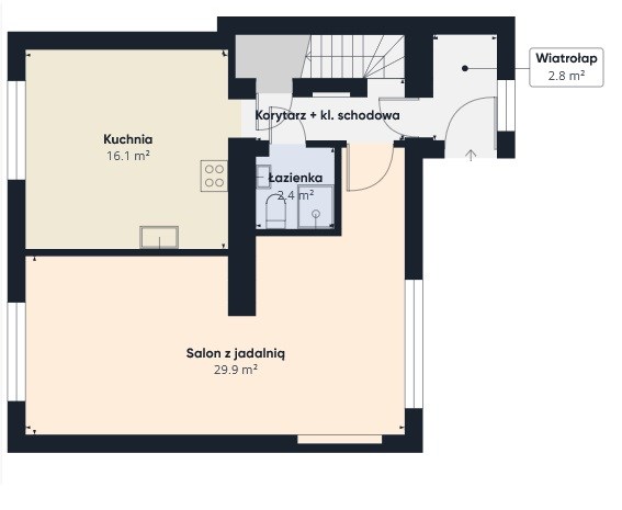 Wnętrze domu zostało zaprojektowane z myślą o funkcjonalności i wygodzie mieszkańców. Na parterze znajduje się jasny, przestronny salon połączony z jadalnią, który tworzy centralne miejsce spotkań domowników. Kuchnia o powierzchni ok. 16 m² została wyposażona w zabudowę meblową oraz sprzęt AGD i stanowi prawdziwe serce domu. Na tym poziomie znajduje się również łazienka z prysznicem (2,4 m²) oraz praktyczny wiatrołap.