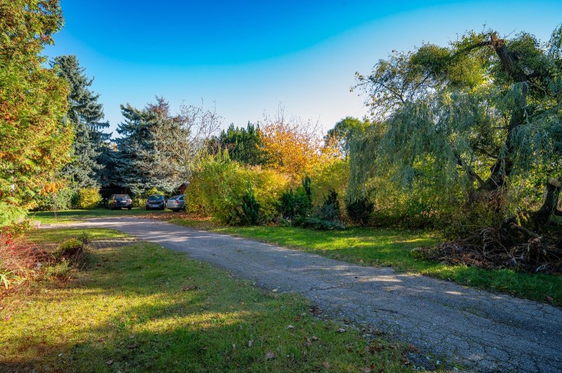 Zadbana zieleń: drzewa liściaste, iglaste i owocowe.