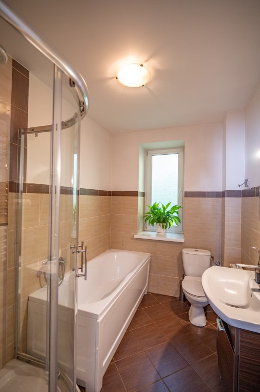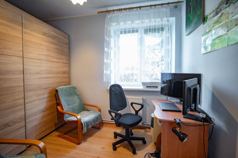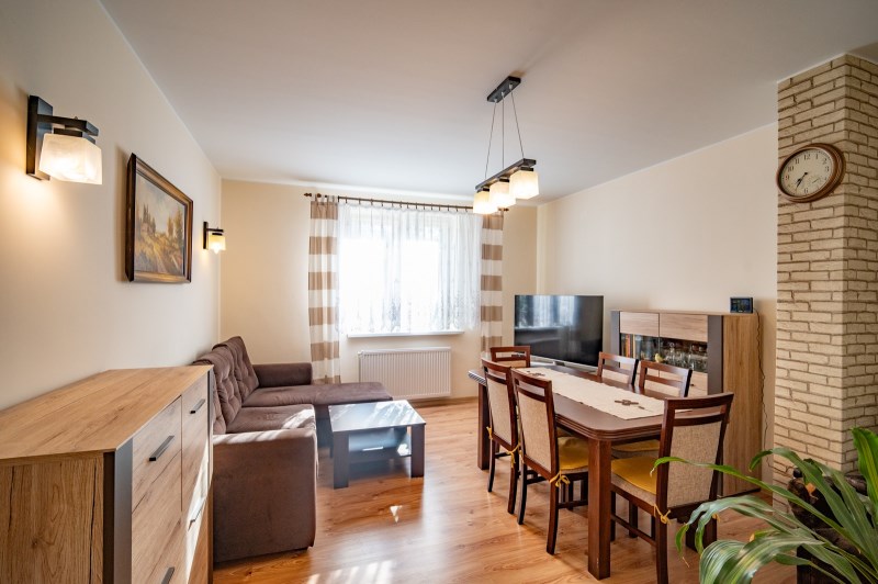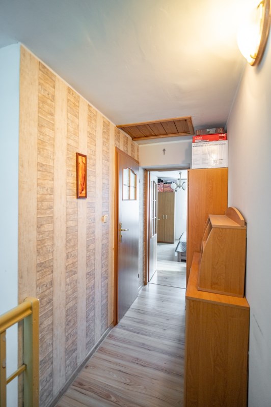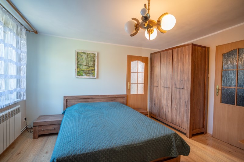 Okna PCV oraz częściowo drewniane. Wnętrza wykończone gładziami gipsowymi, tapetami, na podłogach panele i terakota.