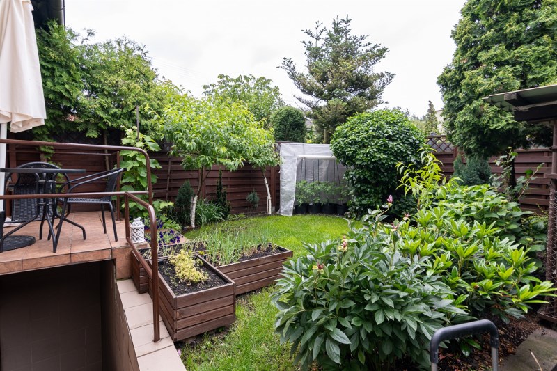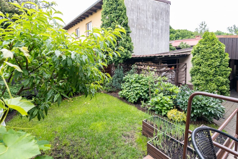 Działka jest w pełni zagospodarowana, obsadzona bujną roślinnością.