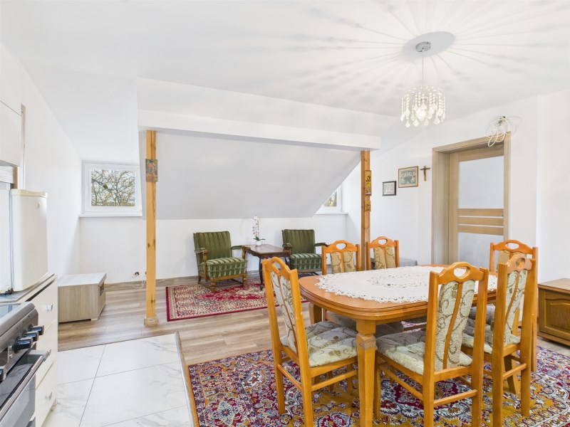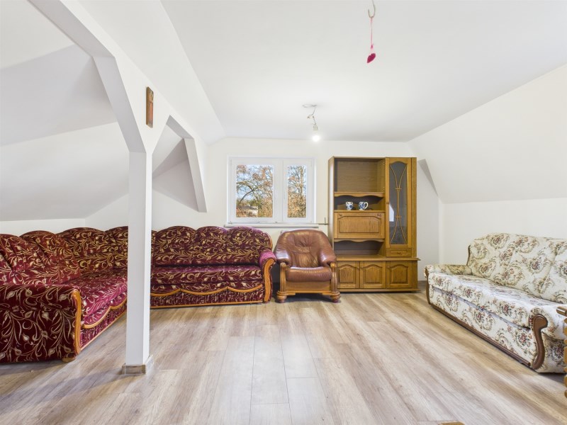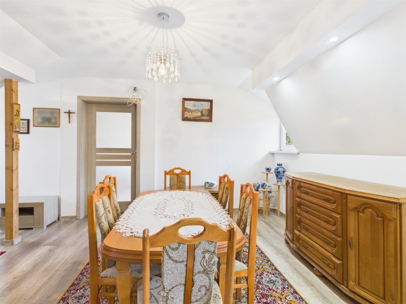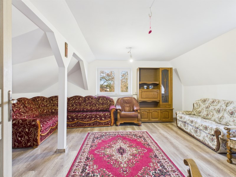 Przedmiotem oferty jest działka o pow. 411 m2 zabudowana domem o funkcji mieszkalno - usługowej, wolnostojącym dwukondygnacyjnym o pow. całkowitej ok. 139 m2, pow. użytkowej ok. 128 m2. Dom wybudowany metodą tradycyjną, murowany z cegły, ocieplony styropianem. Dach konstrukcji drewnianej kryty blachodachówką . Wymienione poszycie dachu rynny, stolarka okienna 2 lata temu. Na podłodze panele w aneksie kuchennym i łazience terakota. Wymieniona instalacja elektryczna i wodno-kanalizacyjna . Dom ogrzewany grzejnikami elektrycznymi. Do tej pory służył właścicielom wyłącznie dla zaspokojenia potrzeb rekreacyjnych.