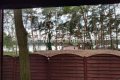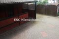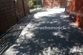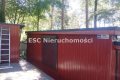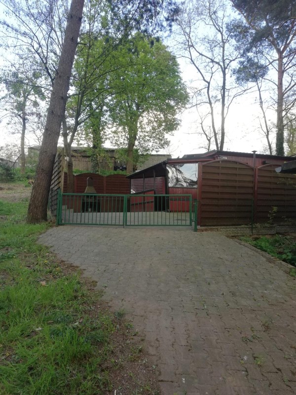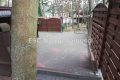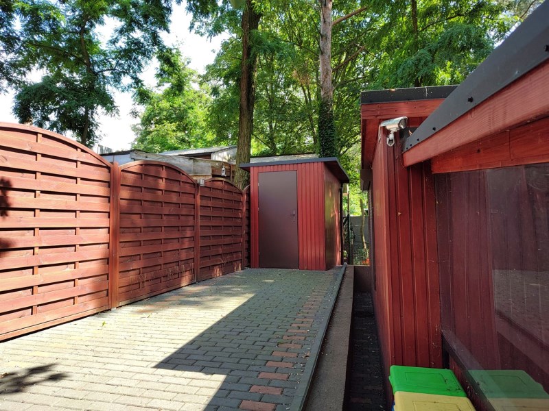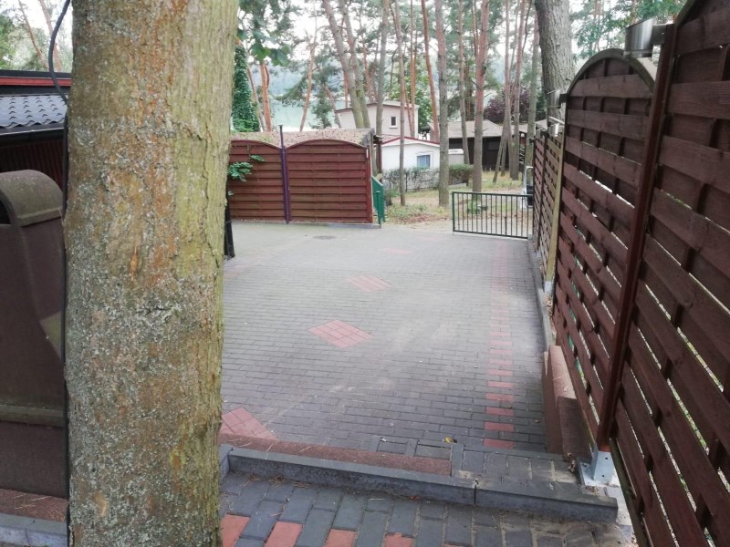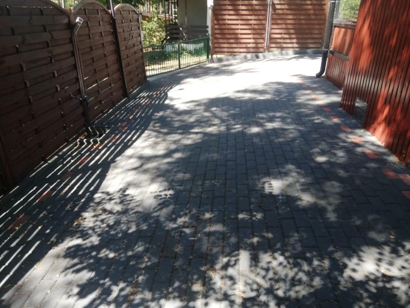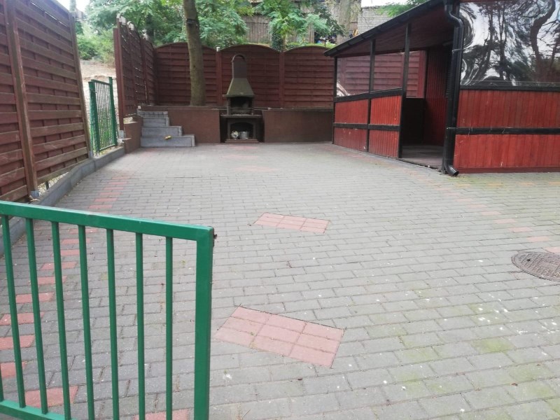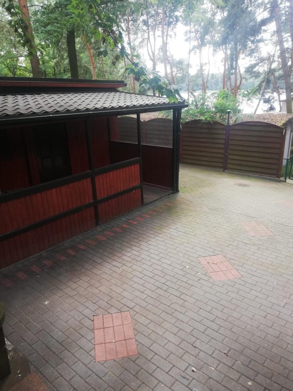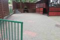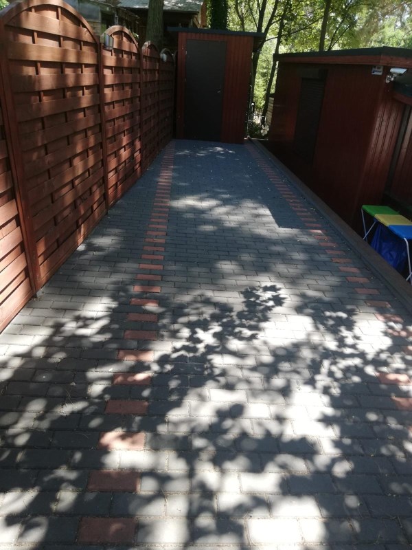 Teren ogrodzony, wyłożony kostką brukową. Na działce znajduje się drewniana szopa