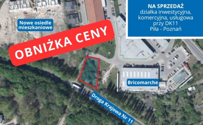 Na sprzedaż działka inwestycyjna zlokalizowana w Chodzieży bezpośrednio przy drodze krajowej nr 11 kierunek Piła -Poznań. Działka jest objęta miejscowym planem zagospodarowania przestrzennego jako 2U - tereny zabudowy usługowej. Możliwe do wybudowania budynki usługowe, w tym budynki handlowe o powierzchni do 750 m2. Bardzo dobra lokalizacja, ze względu na pobliskie nowo powstające osiedle mieszkaniowe oraz ciąg pieszo-rowerowy idący wzdłuż działki z drogi krajowej (11) do drogi wojewódzkiej (193). Wjazd do działki z drogi dwustronny: szerokość ok. 22 m.DZIAŁKA INWESTYCYJNA