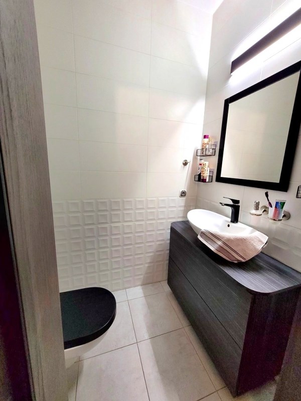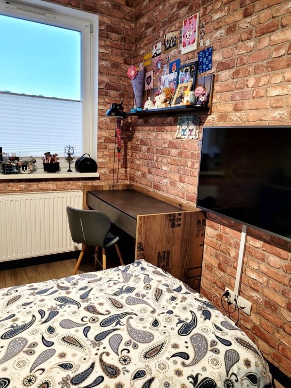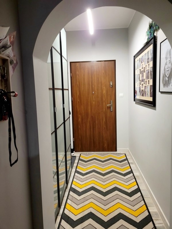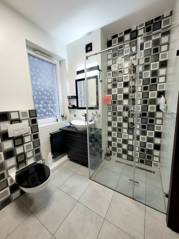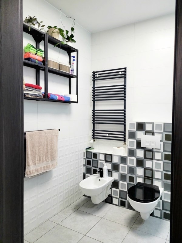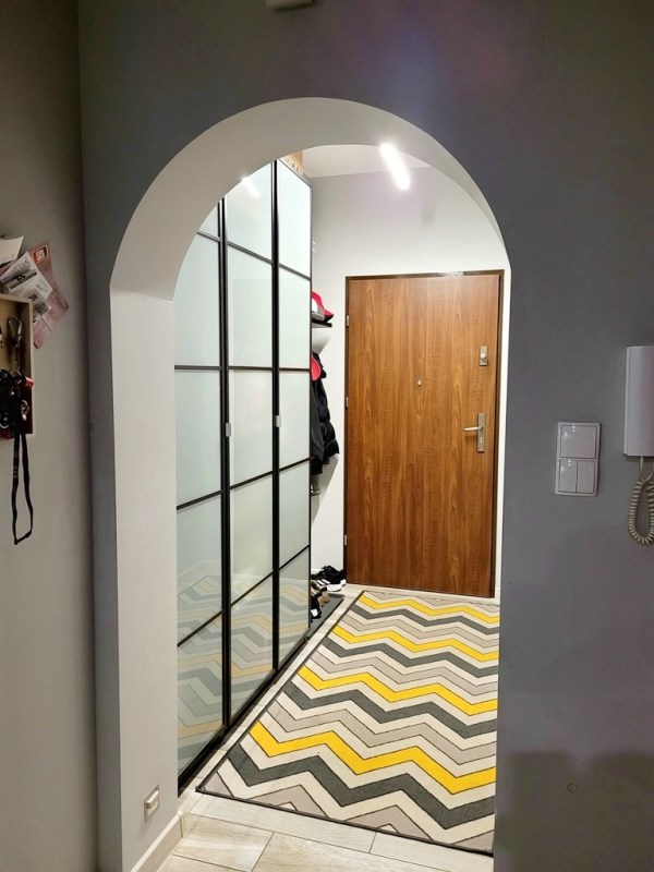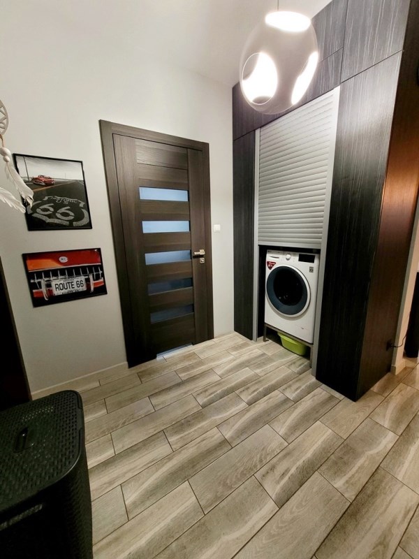 - Dodatkowo: w przedpokoju znajduje się pralka, estetycznie ukryta za roletą – praktyczne i wygodne rozwiązanie.