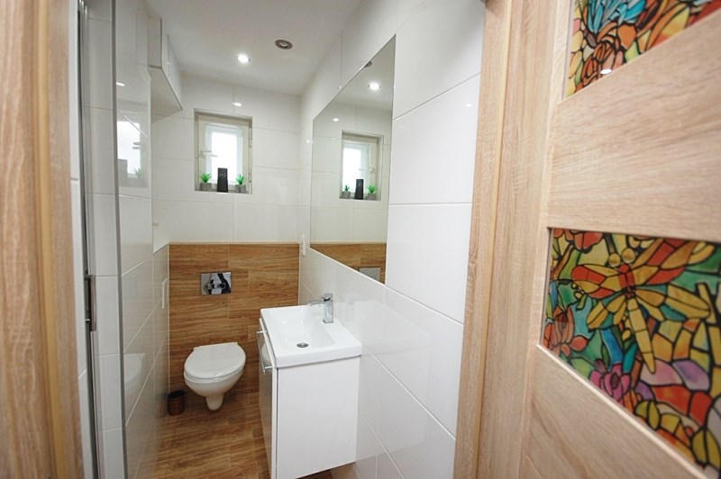 4.Łazienka-ok 3,502 całość w glazurze i terakocie,kabina prysznicowa,umywalka z szafką łazienkową,grzejnik drabinkowy
