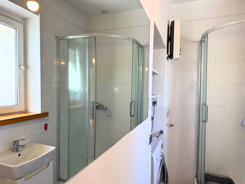 - łazienka z oknem (4,33 m²) – aktualnie z prysznicem, umywalką i WC, ale do własnej aranżacji