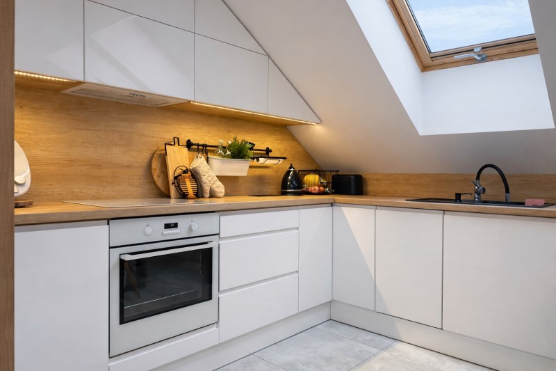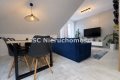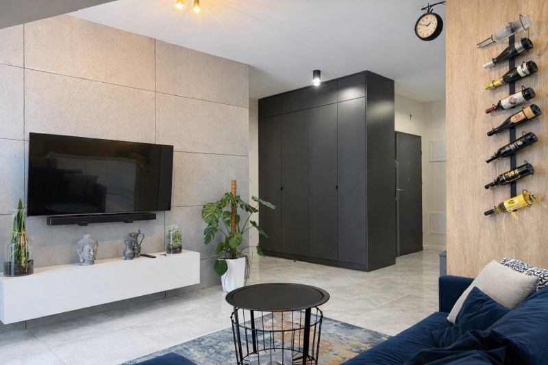 Przestronny salon z jadalnią i aneksem kuchennym (razem 20 m²), z dekoracyjną betonową ścianą multimedialną, tworzący centralną, otwartą przestrzeń do codziennego życia i integracji domowników. Kuchnia w pełni wyposażona: meble na wymiar, lodówka, zmywarka, piekarnik i płyta indukcyjna.