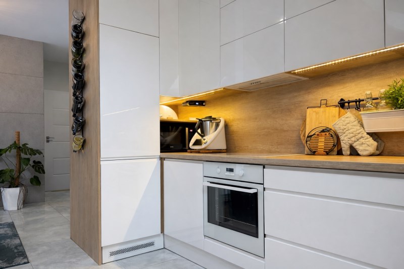 Przestronny salon z jadalnią i aneksem kuchennym (razem 20 m²), z dekoracyjną betonową ścianą multimedialną, tworzący centralną, otwartą przestrzeń do codziennego życia i integracji domowników. Kuchnia w pełni wyposażona: meble na wymiar, lodówka, zmywarka, piekarnik i płyta indukcyjna.
