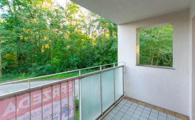 Wyjątkowo przestronny balkon z fantastycznym widokiem na zieleń - tu poranna kawa smakuje jeszcze lepiej.