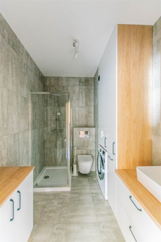 - łazienka wyposażona w zabudowę pod wymiar oraz pralkę