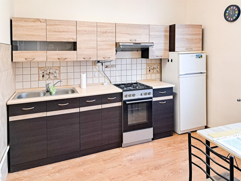 Na podłogach panele podłogowe, kuchnia umeblowana, w łazience glazura, terakota i natrysk.