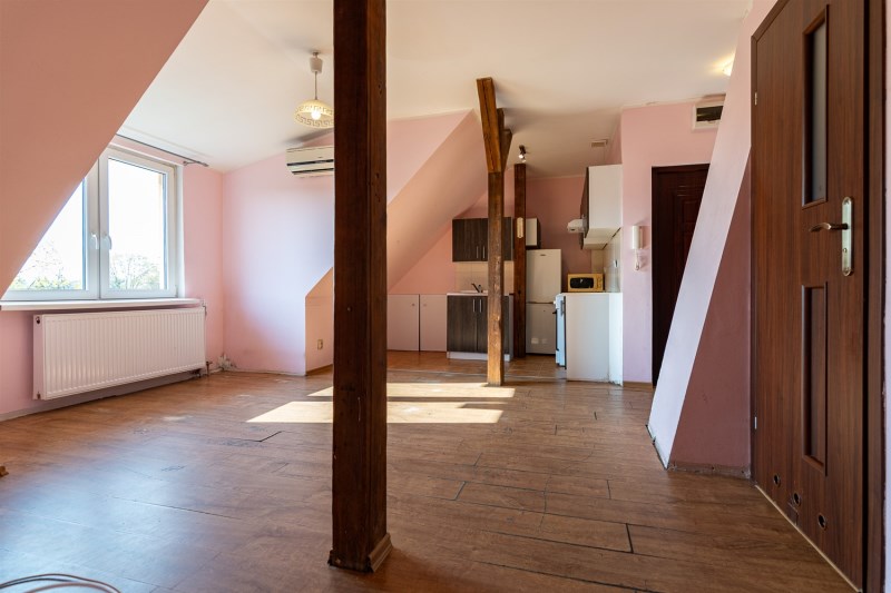 Lokal usytuowany jest na poddaszu (II piętrze) w budynku wybudowanym w latach 50', zaledwie 350m od parku miejskiego.