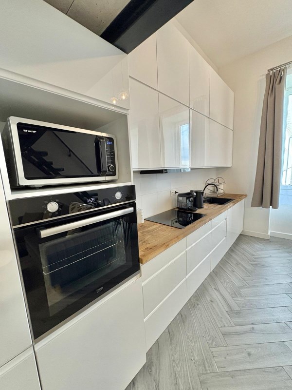 Mieszkanie zostało wykończone w wysokim standardzie i jest w pełni wyposażone w nowoczesny sprzęt AGD (zmywarka, piekarnik, płyta indukcyjna, mikrofalówka, lodówka) oraz telewizor.