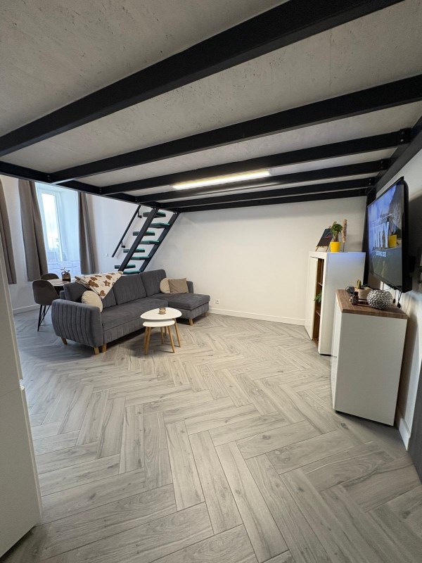 Nowoczesna kawalerka o powierzchni 38 m² z antresolą (ok. 10 m²) w budynku z 2022 roku przy ul. Kołobrzeskiej w Pile. Wysokie na 3,5 m wnętrze tworzy przestronną, industrialną atmosferę.