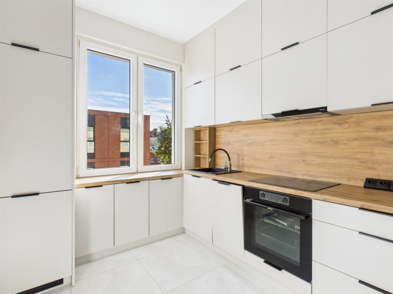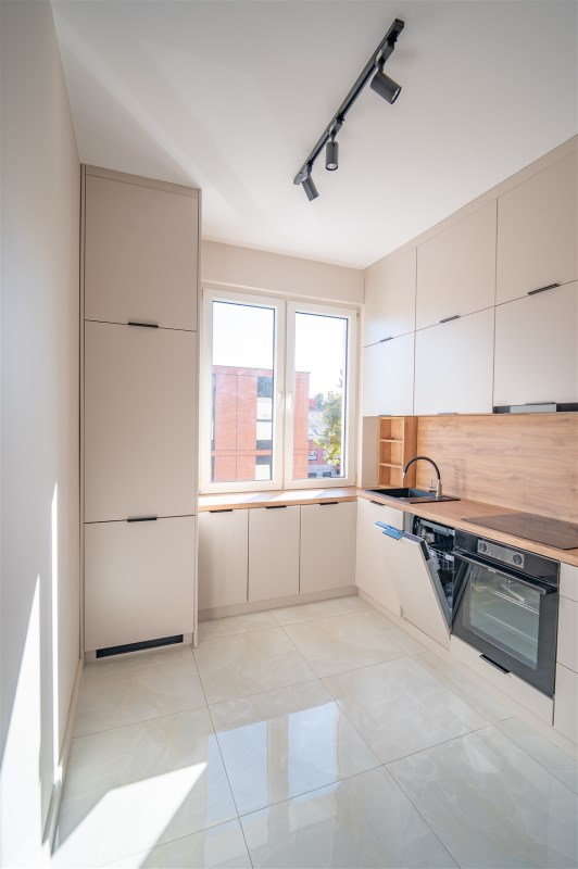 Kuchnia o powierzchni 7,9 m2 wyposażona w nowe meble robione na wymiar - w kolorze kaszmir oraz nowy sprzęt AGD (lodówka, zmywarka, piekarnik, płyta indukcyjna). Kuchnia wyposażona w duże okno, przez co jest bardzo jasna.