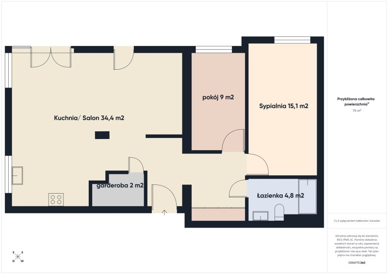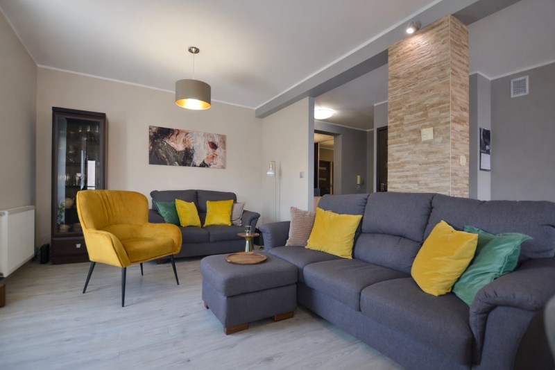 - stylowy salon z aneksem kuchennym o pow. 34,4 m2 w pełni wyposażonym w sprzęt AGD