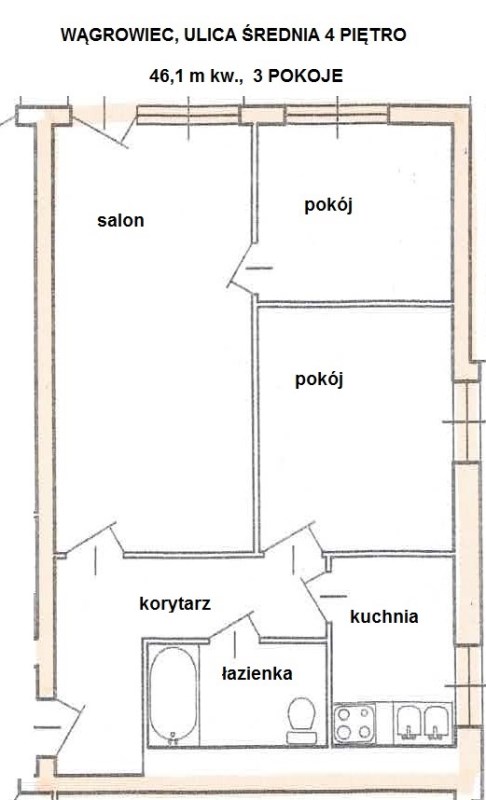 * Układ pomieszczeń: 3 pokoje, kuchnia, łazienka z WC, korytarz