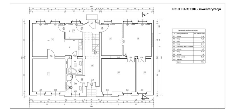 - powierzchnia mieszkalna (115,55 m2) składająca się z 5 pokoi, 3 kuchni, łazienki