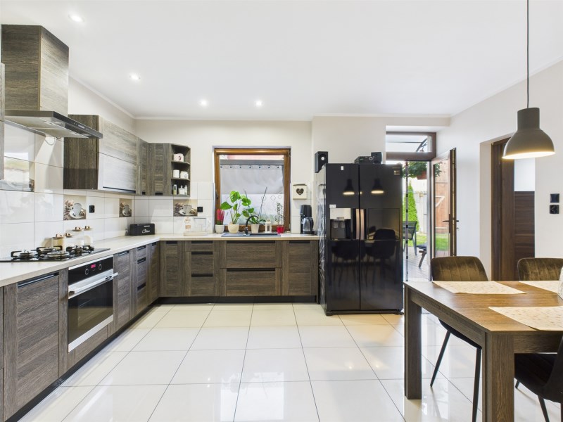 W kuchni zastosowano nowoczesne urządzenia AGD oraz przestronną zabudowę, co sprawia, że gotowanie staje się prawdziwą przyjemnością. Salon jest przestronny i komfortowy, z wydzieloną strefą wypoczynkową. Dodatkowo, na parterze znajduje się przestronny holl, który prowadzi na górę.