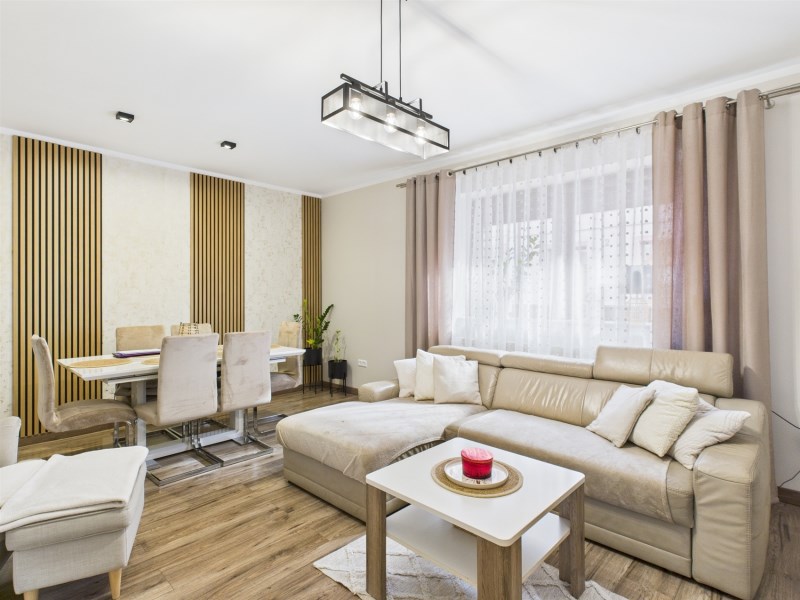Nieruchomość przeszła kompleksowy remont, łącząc nowoczesne rozwiązania z funkcjonalnym układem przestrzeni. Parter to część dzienna z tarasem - idealna do codziennego relaksu oraz spotkań z rodziną i przyjaciółmi, a wysokiej jakości wykończenia podłóg, ścian i sufitów nadają elegancki i przytulny charakter.