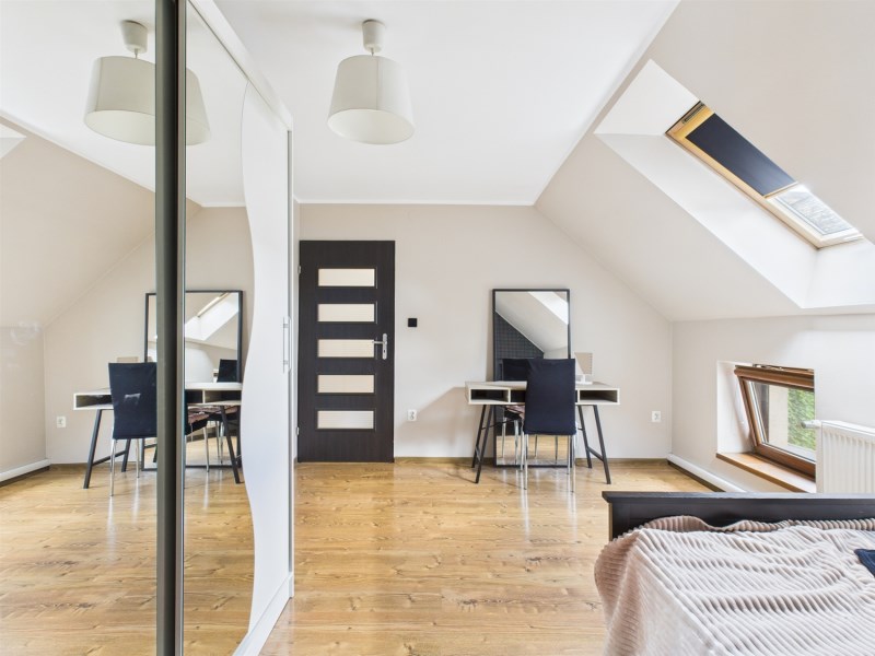 Poddasze zostało zaadaptowane na prywatną część sypialną, oferującą komfort i spokój. Znajdują się tu trzy przytulne sypialnie, każda przestronna. Jest tu także pomieszczenie obecnie wykorzystywane na potrzeby biurowe, oraz pomieszczenie gospodarcze lub miejsce na garderobę. Wnętrza poddasza zostały zaprojektowane z myślą o maksymalnej funkcjonalności, zapewniając komfort użytkowania.