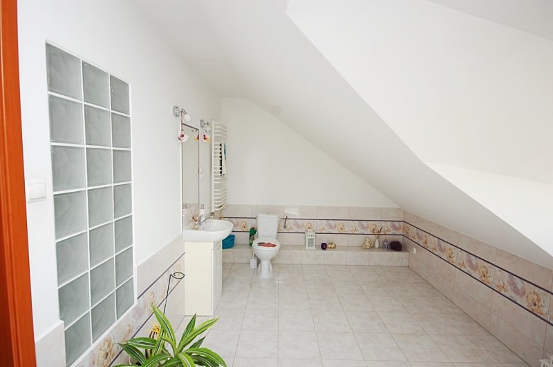 7.Łazienka-8,90m2 całość ścian i podłogi pokryte glazurą i terakotą,narożnikowa wanna,kabina prysznicowa,dwustanowiskowe umywalki z szafkami łazienkowymi,duże lustro,dwa okna pcv