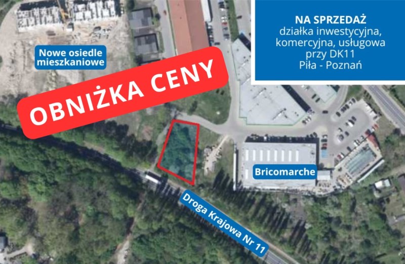 Na sprzedaż działka inwestycyjna zlokalizowana w Chodzieży bezpośrednio przy drodze krajowej nr 11 kierunek Piła -Poznań. Działka jest objęta miejscowym planem zagospodarowania przestrzennego jako 2U - tereny zabudowy usługowej. Możliwe do wybudowania budynki usługowe, w tym budynki handlowe o powierzchni do 750 m2. Bardzo dobra lokalizacja, ze względu na pobliskie nowo powstające osiedle mieszkaniowe oraz ciąg pieszo-rowerowy idący wzdłuż działki z drogi krajowej (11) do drogi wojewódzkiej (193). Wjazd do działki z drogi dwustronny: szerokość ok. 22 m.DZIAŁKA INWESTYCYJNA