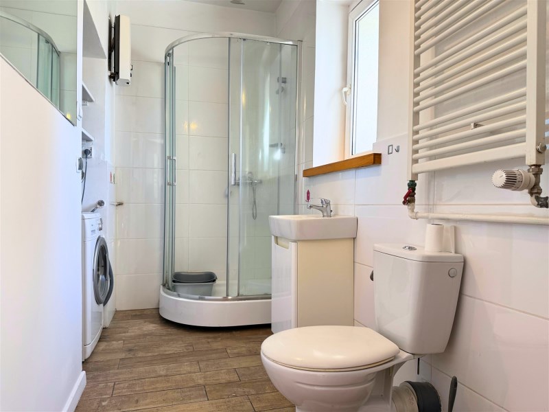 - łazienka z oknem (4,33 m²) – aktualnie z prysznicem, umywalką i WC, ale do własnej aranżacji