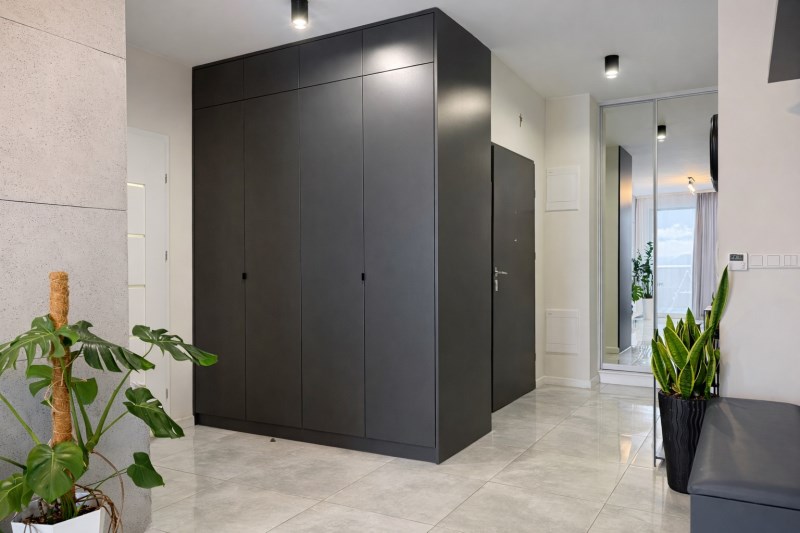 Duży korytarz (8,22 m²) z dwiema szafami pod wymiar, zapewnia miejsce do przechowywania.