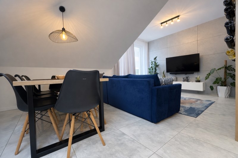 Przestronny salon z jadalnią i aneksem kuchennym (razem 20 m²), z dekoracyjną betonową ścianą multimedialną, tworzący centralną, otwartą przestrzeń do codziennego życia i integracji domowników. Kuchnia w pełni wyposażona: meble na wymiar, lodówka, zmywarka, piekarnik i płyta indukcyjna.