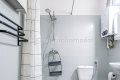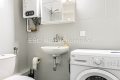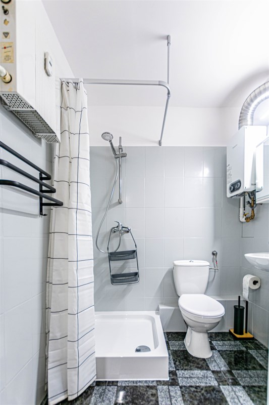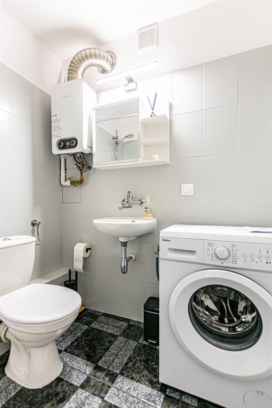 - W łazience - pralka, brodzik prysznicowy, umywalka, szafka z lustrem, grzejnik typu drabinka i Junkers