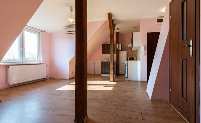 Lokal usytuowany jest na poddaszu (II piętrze) w budynku wybudowanym w latach 50', zaledwie 350m od parku miejskiego.