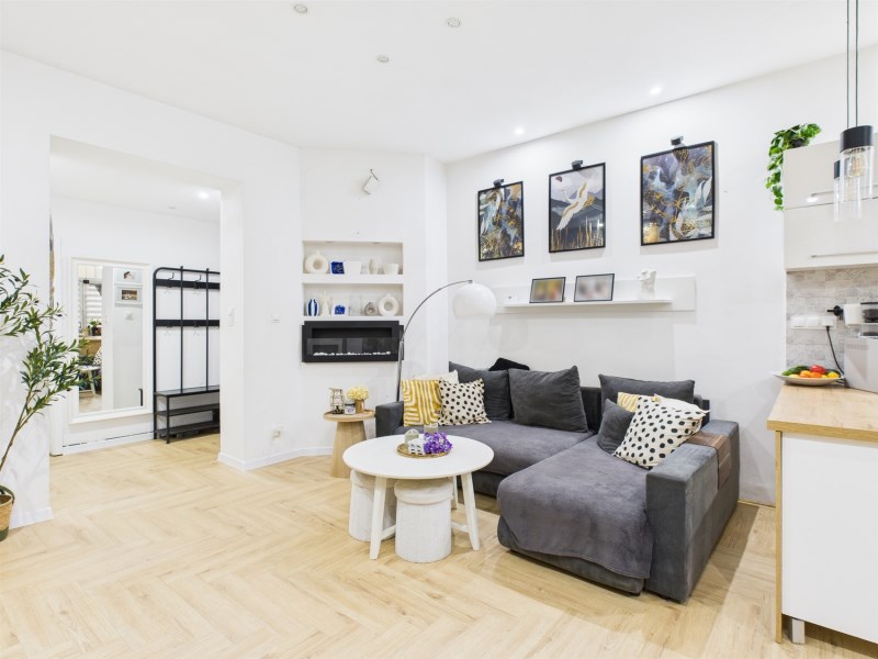 W całym mieszkaniu zastosowano ogrzewanie podłogowe, co zapewnia komfort cieplny przez cały rok.