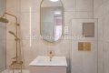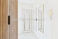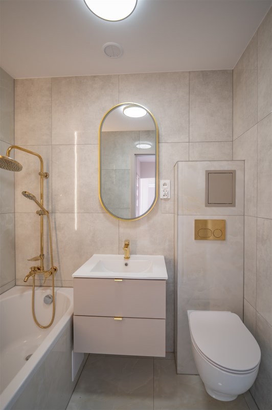 Łazienka o powierzchni 3,2 m2, elegancka, wykończona w jasnych płytkach ze złotym wykończeniem, wyposażona w wannę z prysznicem, umywalkę z szafką, oraz WC w zabudowie;