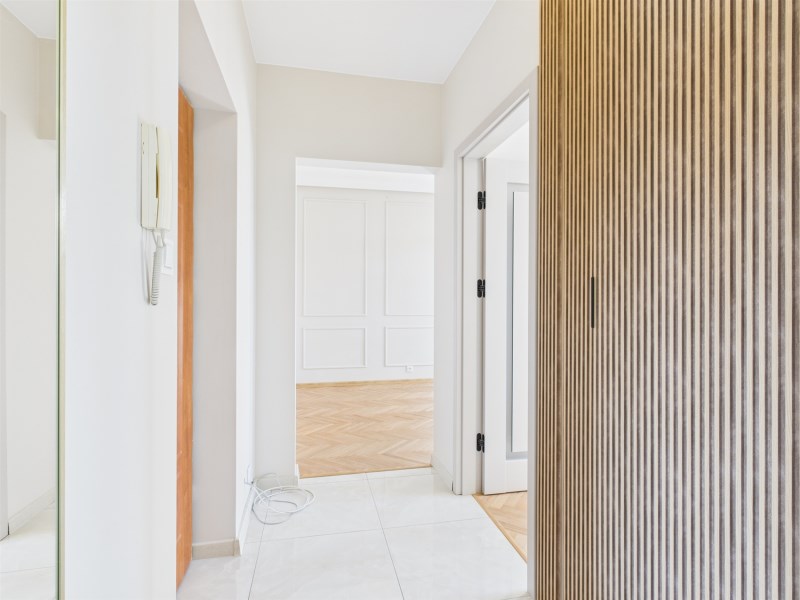 Przedpokój o powierzchni 4,2 m2, wyposażony w szafę wnękową z miejscem na pralkę i półkami, zapewnia dużo miejsca do przechowywania.