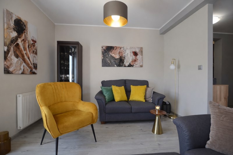 - stylowy salon z aneksem kuchennym o pow. 34,4 m2 w pełni wyposażonym w sprzęt AGD