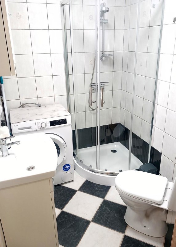 Łazienka - pralka, toaleta, kabina prysznicowa, szafka